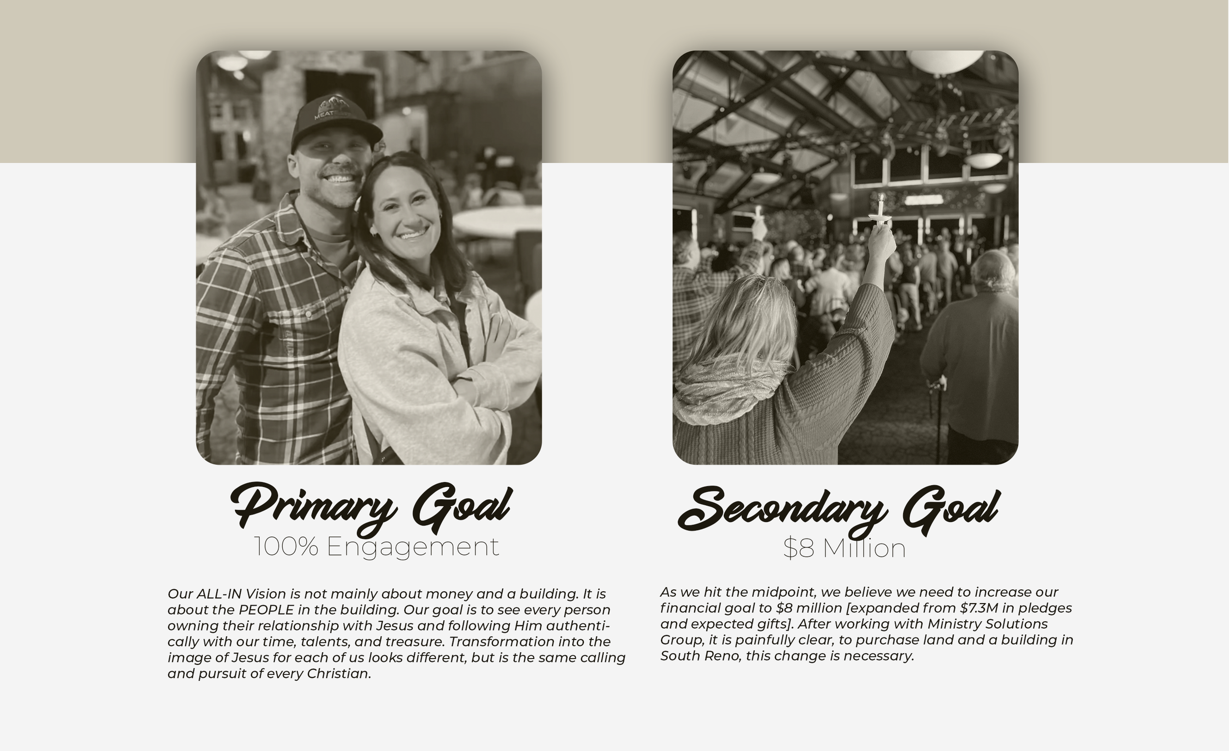 Our goal for this final year remains the same: 100% engagement in discipleship. However, we’re adjusting our financial goal from the $7.3 million “committed” to $8 million. After working with consultants at Ministry Solutions Group, it’s clear this is what’s needed to continue our ministry, and purchase land and a building in South Reno.